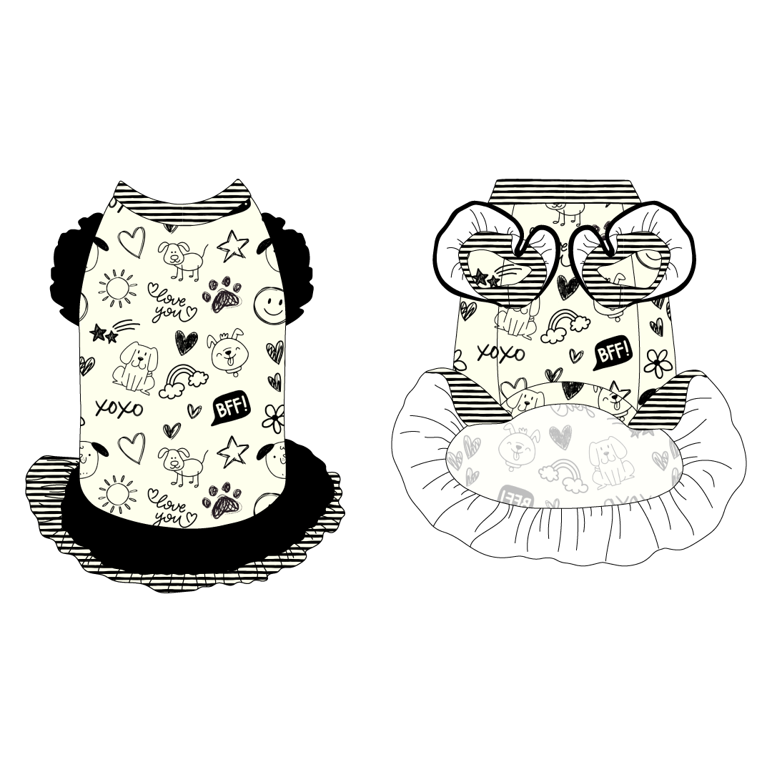 La Petite Shimmy Dress is the ultimate outfit for the girlie girl: so many ruffles!  Get your shimmy on, you feisty furries!  This stretch tank style offers ruffle accents at the shoulders and the hips.  The shoulder ruffle rests over basic arm trim while the underbelly trim keeps your style in place.  You'll appreciate comfort in this design without sacrificing your furrific look!  This outfit offers a lot of stretch, so you'll be dressed in a snap.