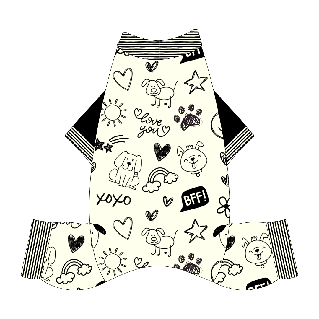 The Mon Ami Jammies sound simple, but not when you look this pawdorable!  This option offers the highest level of relaxation in a fit that's nothing short of cutie patootie charm!  With a snap-up chest, your humans will appreciate the ease of getting you night-night ready.  You'll love the roomy legs, a custom length that keeps your bum covered, and lots of stretch.  Yes furries, you can fetch, sit and nap in your jammies.  You're gonna feel extra cuddly in your Mon Ami Jammies!