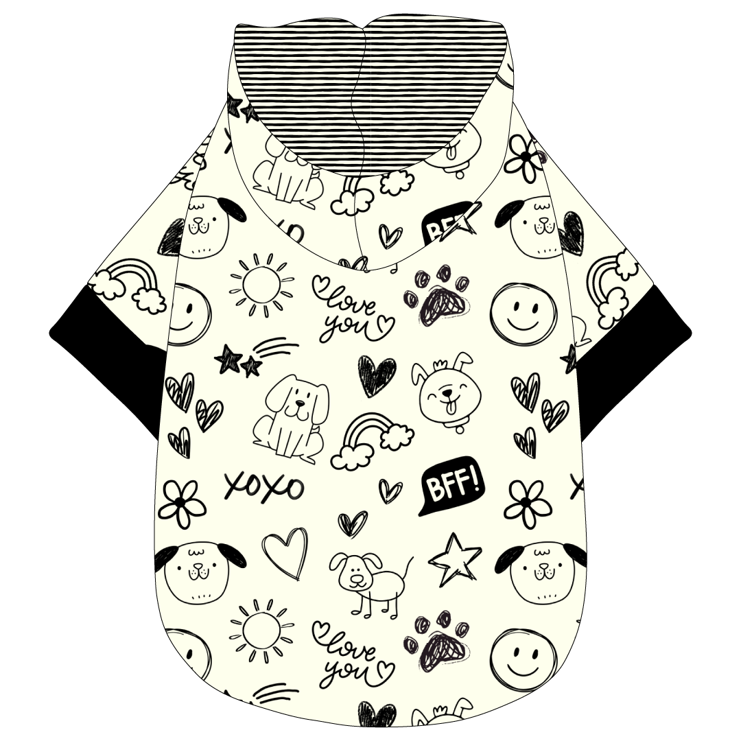 The Hoodie option offers all of the ease of a basic tee with the added look of a fun hood.  The hood is fully lined and completely functional, but also looks on trend resting gently on the upper back.  While your pup will appreciate the comfort of this design, his or her human will love the cuteness overload.  The Hoodie does offer lots of stretch, so you'll never stress at dressing time.  The trim used on the neck and sleeves is also found on the waistband.