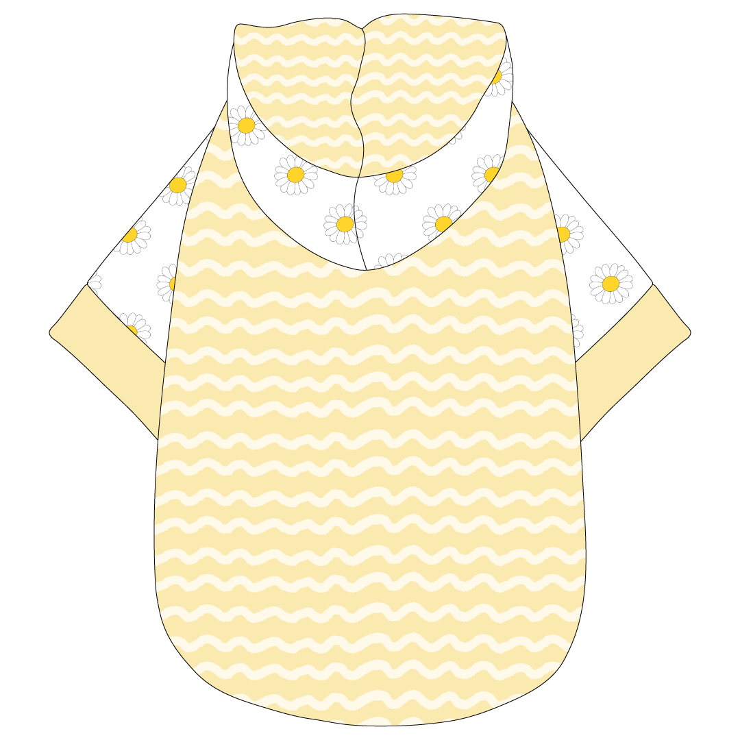 The Hoodie option offers all of the ease of a basic tee with the added look of a fun hood.  The hood is fully lined and completely functional, but also looks on trend resting gently on the upper back.  While your pup will appreciate the comfort of this design, his or her human will love the cuteness overload.  The Hoodie does offer lots of stretch, so you'll never stress at dressing time.  The trim used on the neck and sleeves is also found on the waistband.