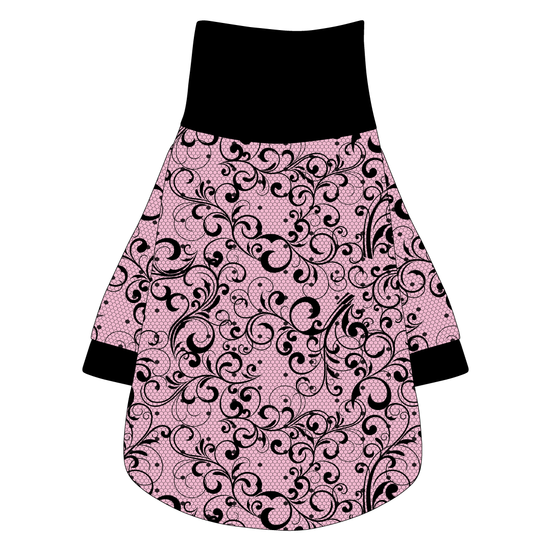 The Turtleneck Tee takes a basic style and amps it up with much wider neck band, resulting in a higher neck line.  This is a great style for breeds that have a longer neck naturally, or for those pups who like a classic design.  Plenty of stretch offers comfort and relaxation.  It also helps pups get dressed with ease.  The trim used on the neck and sleeves is also found on the waistband.